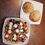 Mix sałat, pomidor, papryka, cebula czerwona, kurczak gyros, bułeczki 2 szt., -